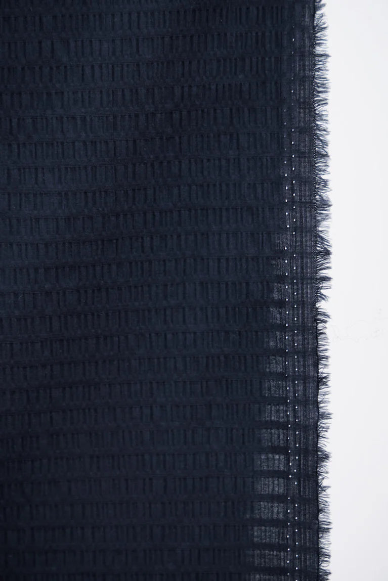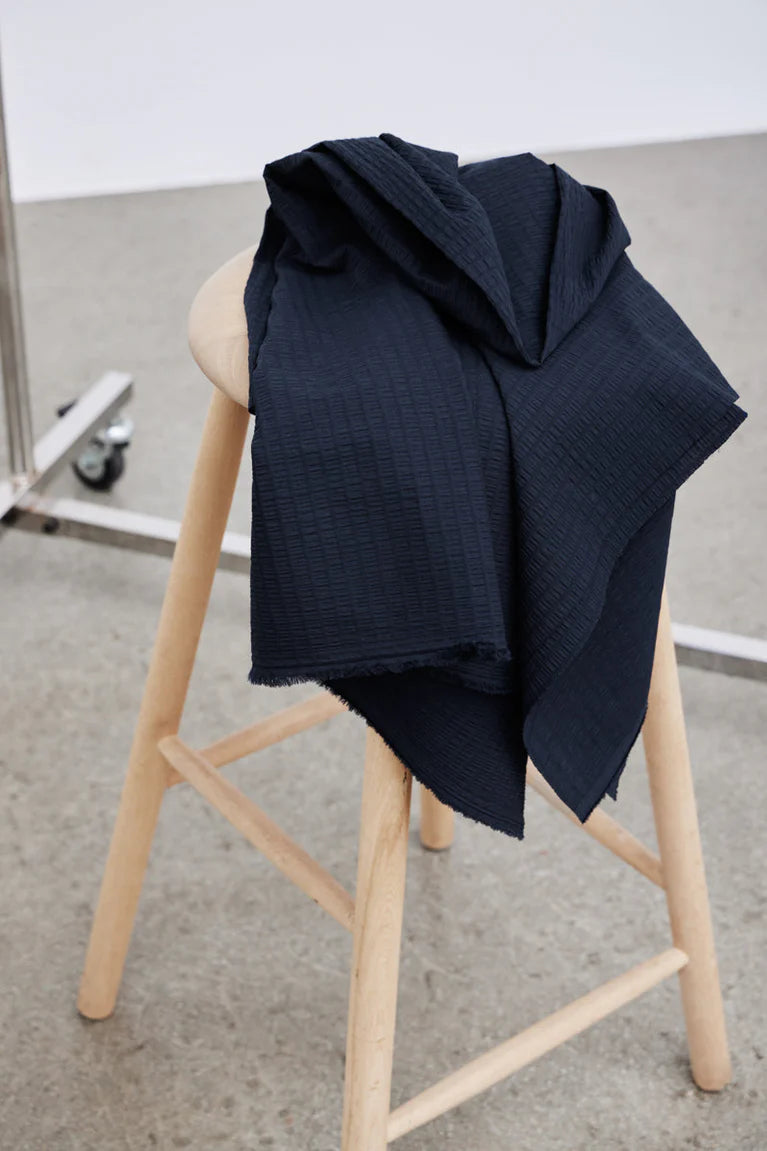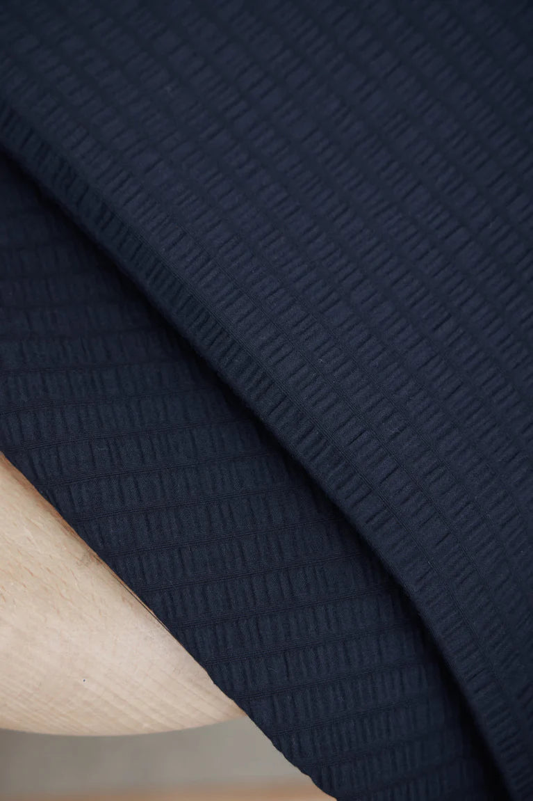 Ronda Seersucker í litnum Navy hefur djúpan, klassískan bláan tón sem gefur efninu tímalausan svip og hentar bæði hversdagsflíkum og fínni hönnun. Létt bómullarefni með náttúrulega mýkt og fallega bylgjóttri seersucker-áferð. Efnið andar vel og fellur mjúklega án þess að missa form, sem gerir það tilvalið í blússur, toppa og létta kjóla.