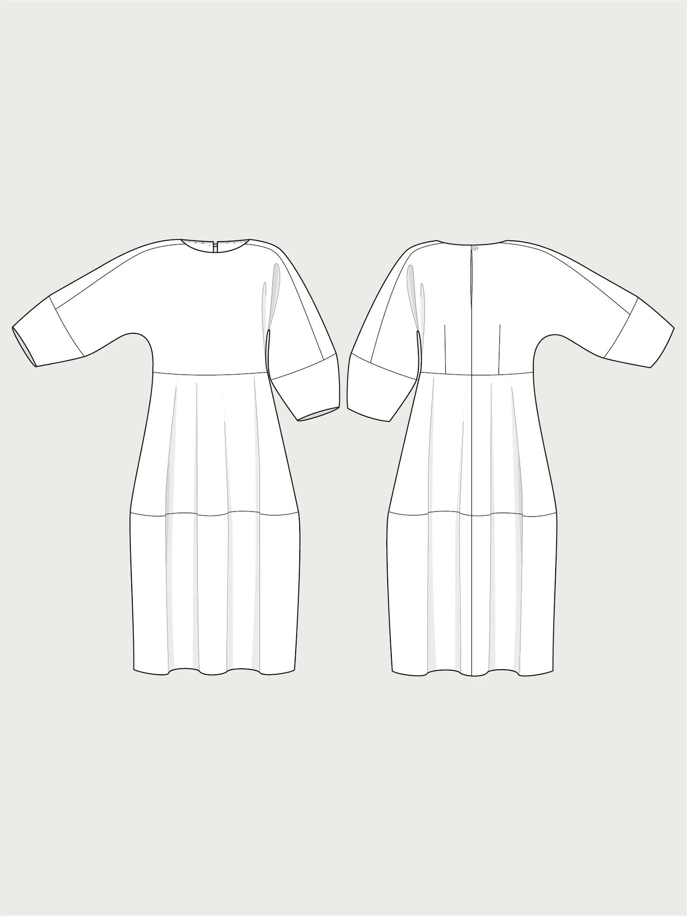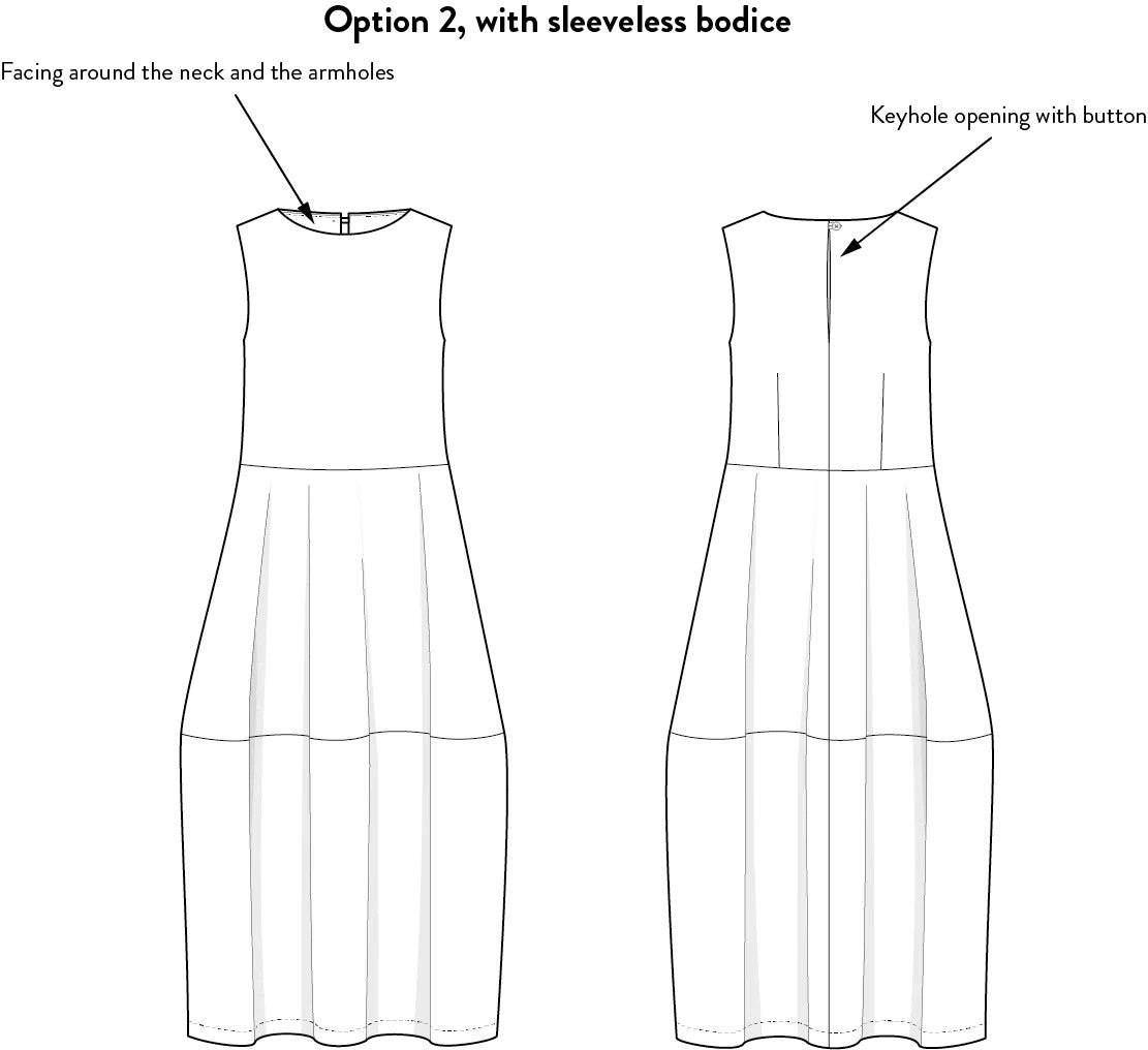 Kjóllinn er með ávölum hálsmáli og lykilgati að aftan sem er lokað með hnappi og lykkju. Hægt er að nota skáborða meðfram hálsmáli og handvegum eða við ermakant. Að sjálfsögðu eru vasar í hliðarsaumum því allir - ekki bara karlar - þurfa vasa.