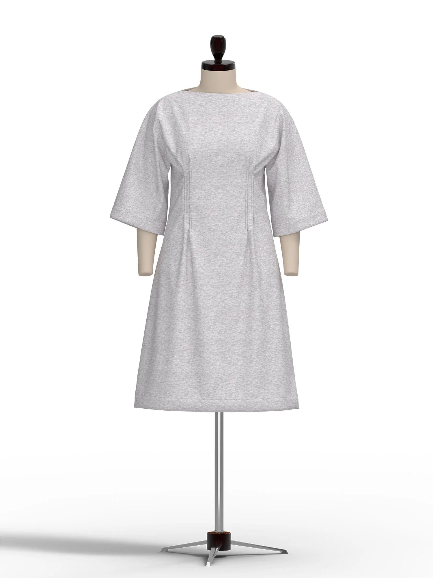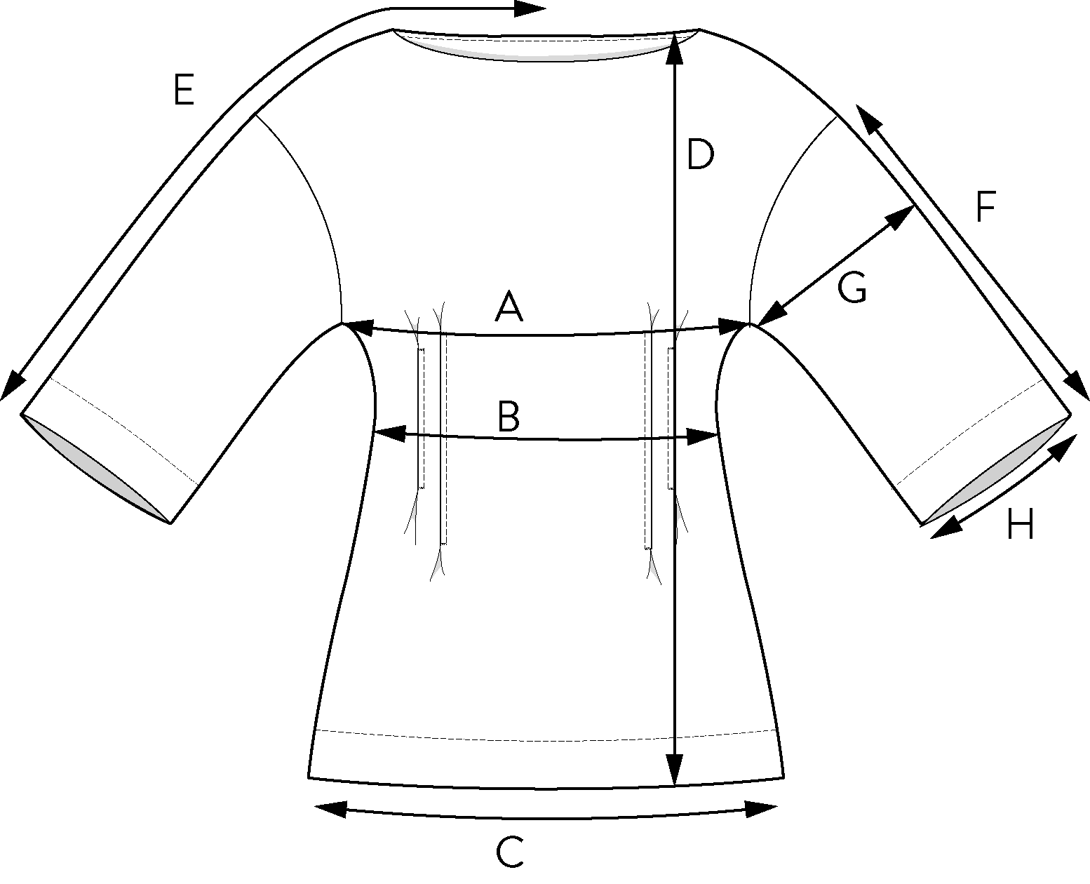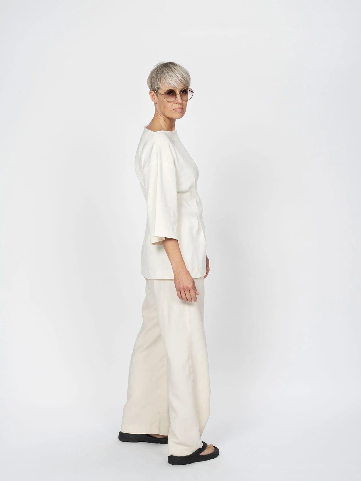 Fitted Waist T-shirt er með bátslaga hálsmáli og mótuðu mitti með toppsaumuðum fellingum að framan og aftan. Hún er hönnuð með lægðri öxl og víðum ermum sem ná niður fyrir olnboga.