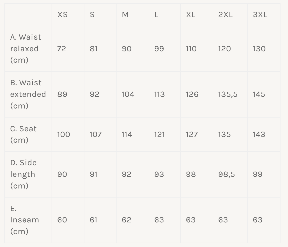 Buxurnar eru með afslöppuðu sniði og sitja neðarlega á mitti, því er mikilvægt að styðjast við (neðri) mittismál og mjaðmamál þegar stærð er valin. Nánari leiðbeiningar má finna hér.