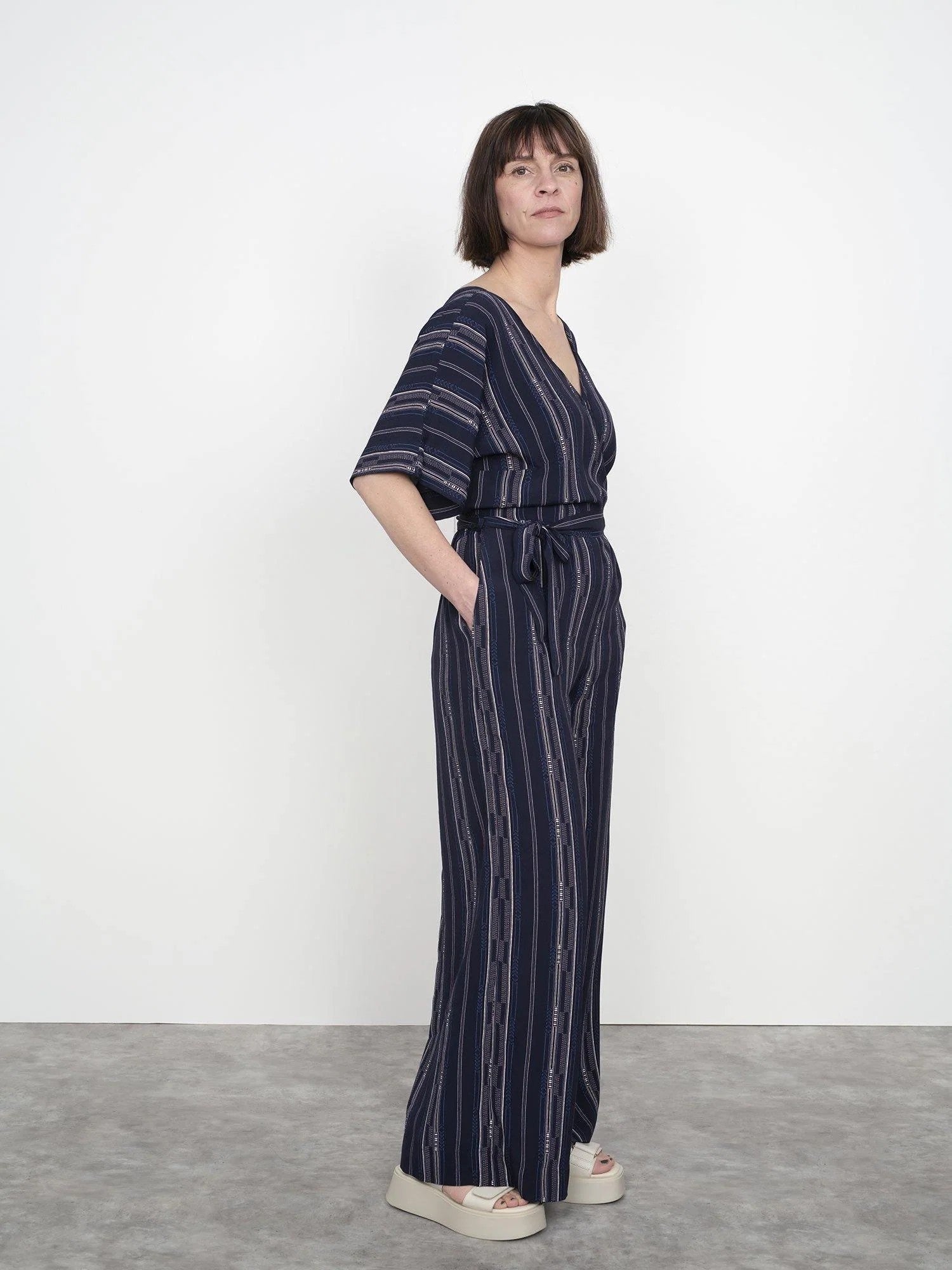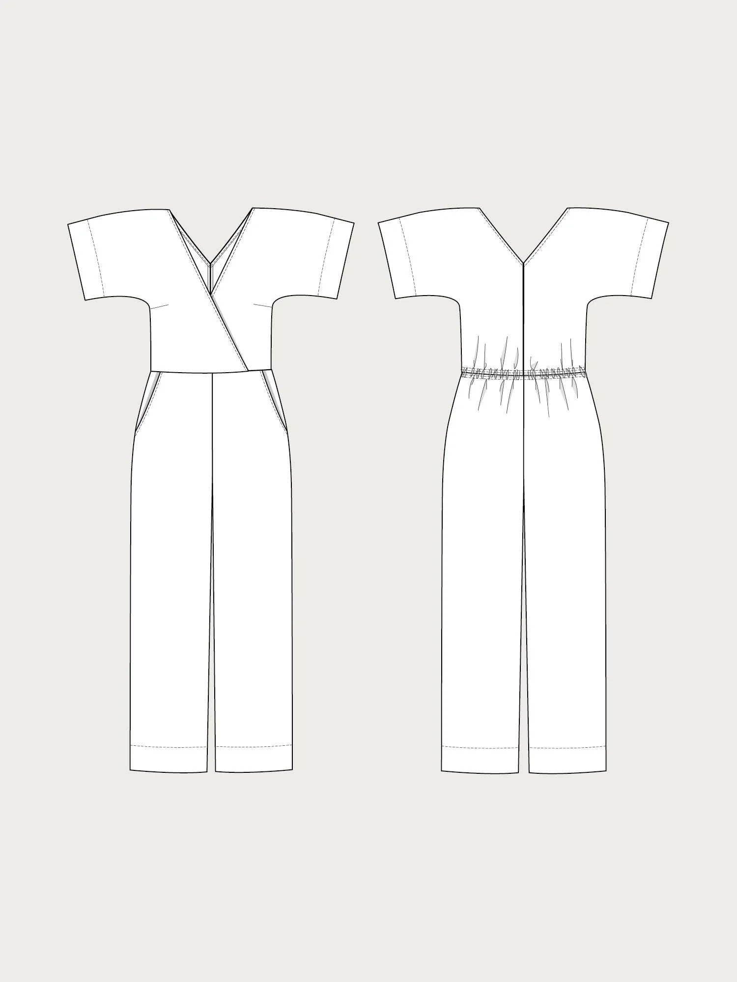Þessi auðveldi og þægilegi víðskálma samfestingur er með víðu V-hálsmáli að framan og aftan. Hann er með vösum, víðum skálmum og teygju í mitti að aftan. Mögulegt er að bæta við belti og beltislykkjum ef vill. Minnir á kaftankjól - en með skálmum!