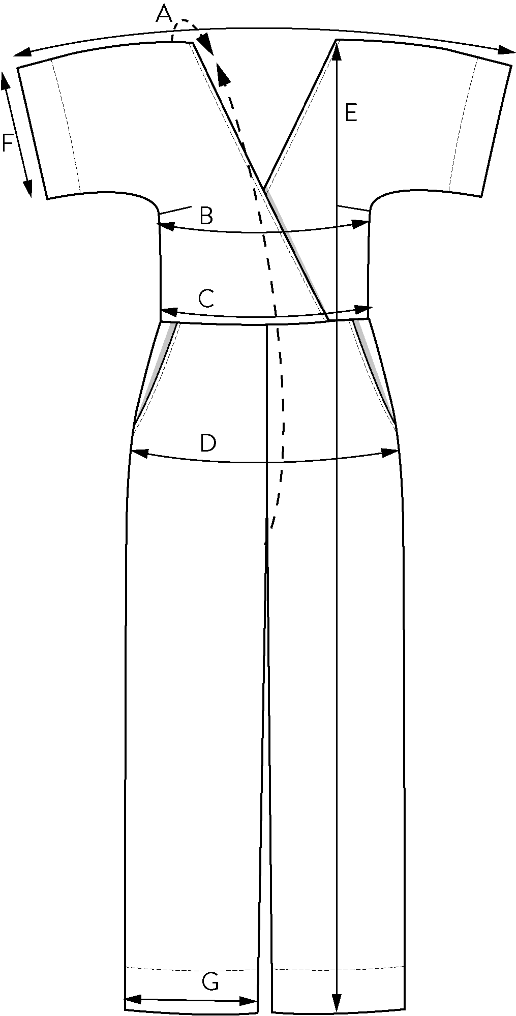 Ef þú ert á milli tveggja stærða skaltu velja þá stærri. Flíkin er hönnuð til að vera rúmgóð. Áður en þú klippir efnið er einnig mikilvægt að mæla bolmælið (H hér að neðan) til að ganga úr skugga um hvort þú þurfir að bæta við lengd svo sniðið passi fullkomlega.