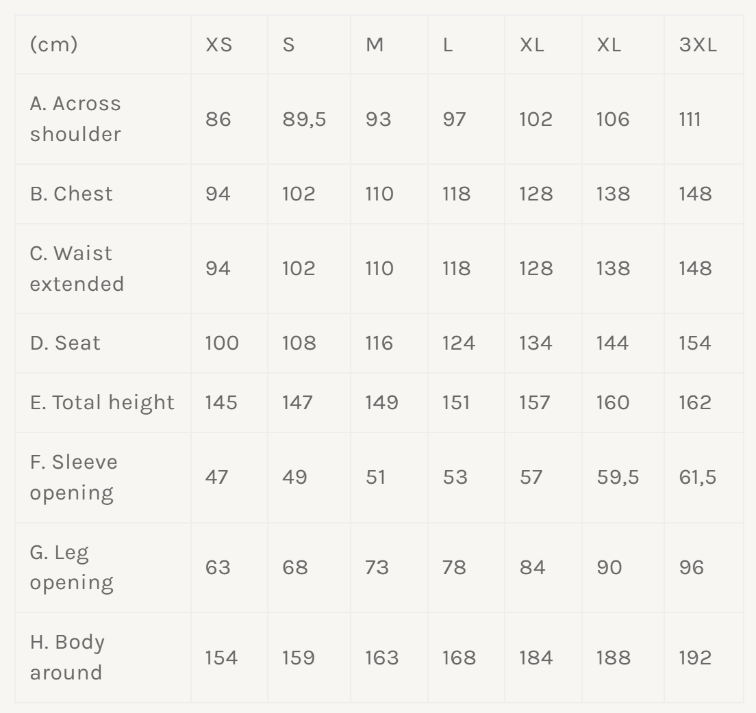 XS 2,9 m / S 3,1 m / M 3,2 m / L 3,2 m / XL 3,2 m / 2XL 3,4 m / 3XL 3,6 m