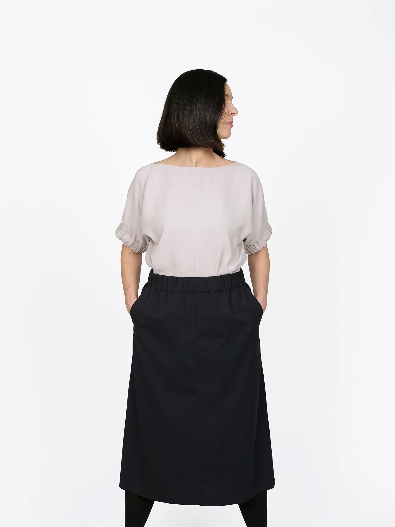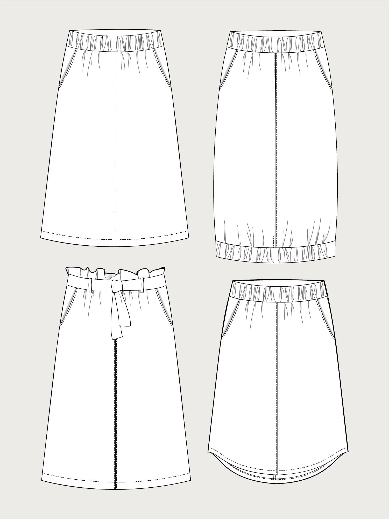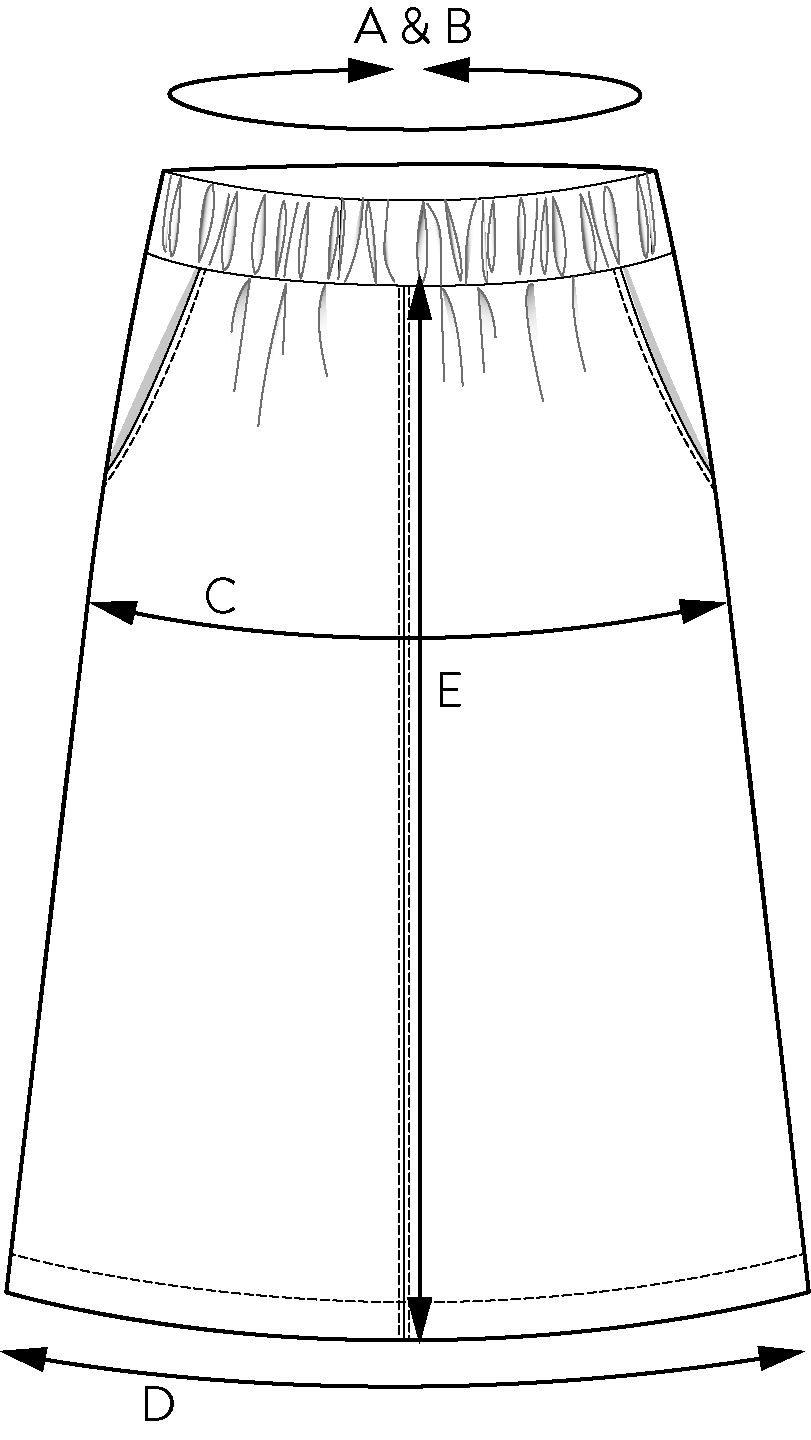 Það er með A-laga sniði, teygju í mitti og skásettum hliðarvösum. Sniðið býður upp á nokkrar útfærslur til að velja úr: hefðbundmið mittisband, „paper bag“ mittisband með beltislykkjum og belti, beinan fald, rúnnaða faldlínu eða fald með teygju.