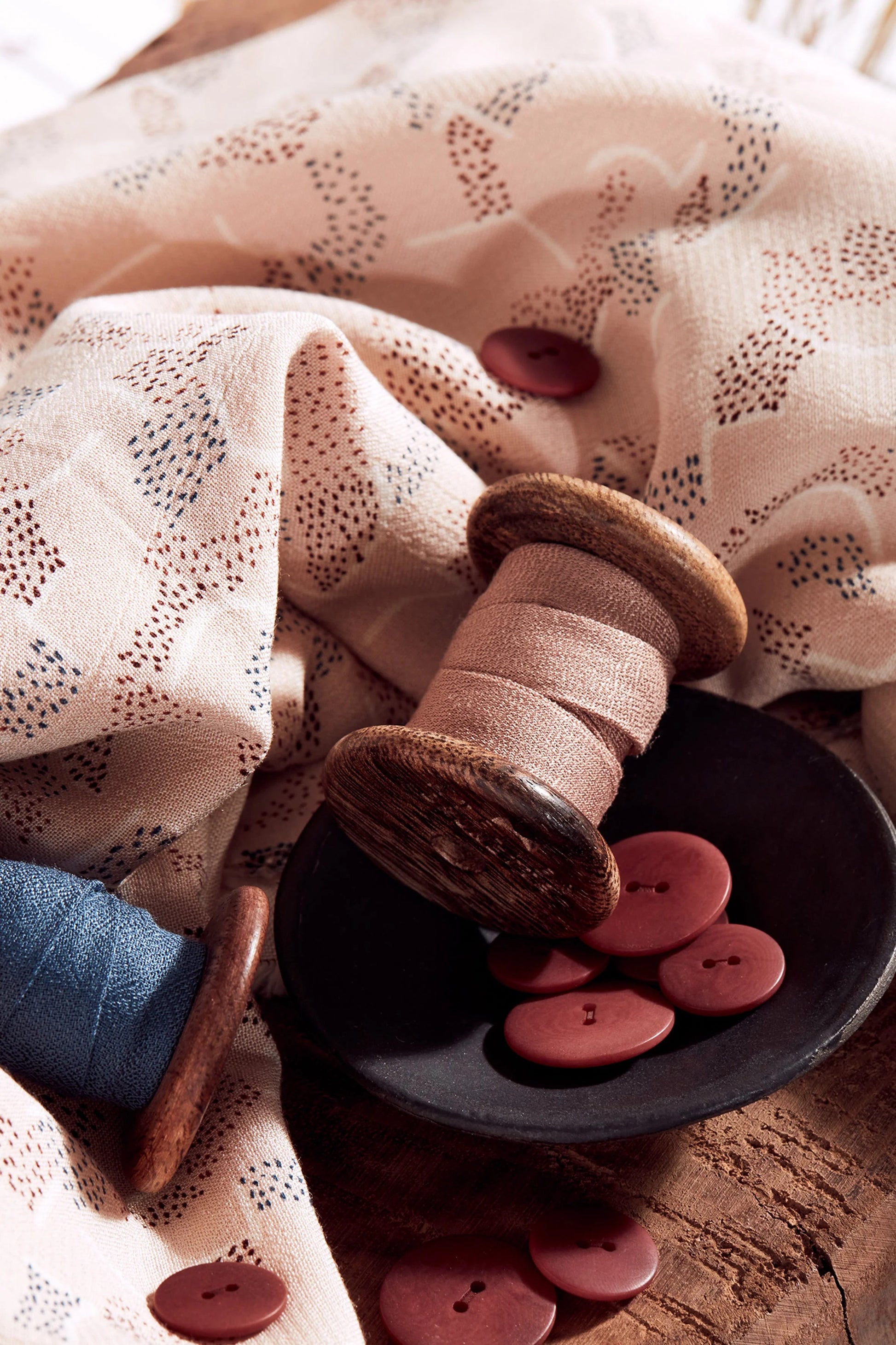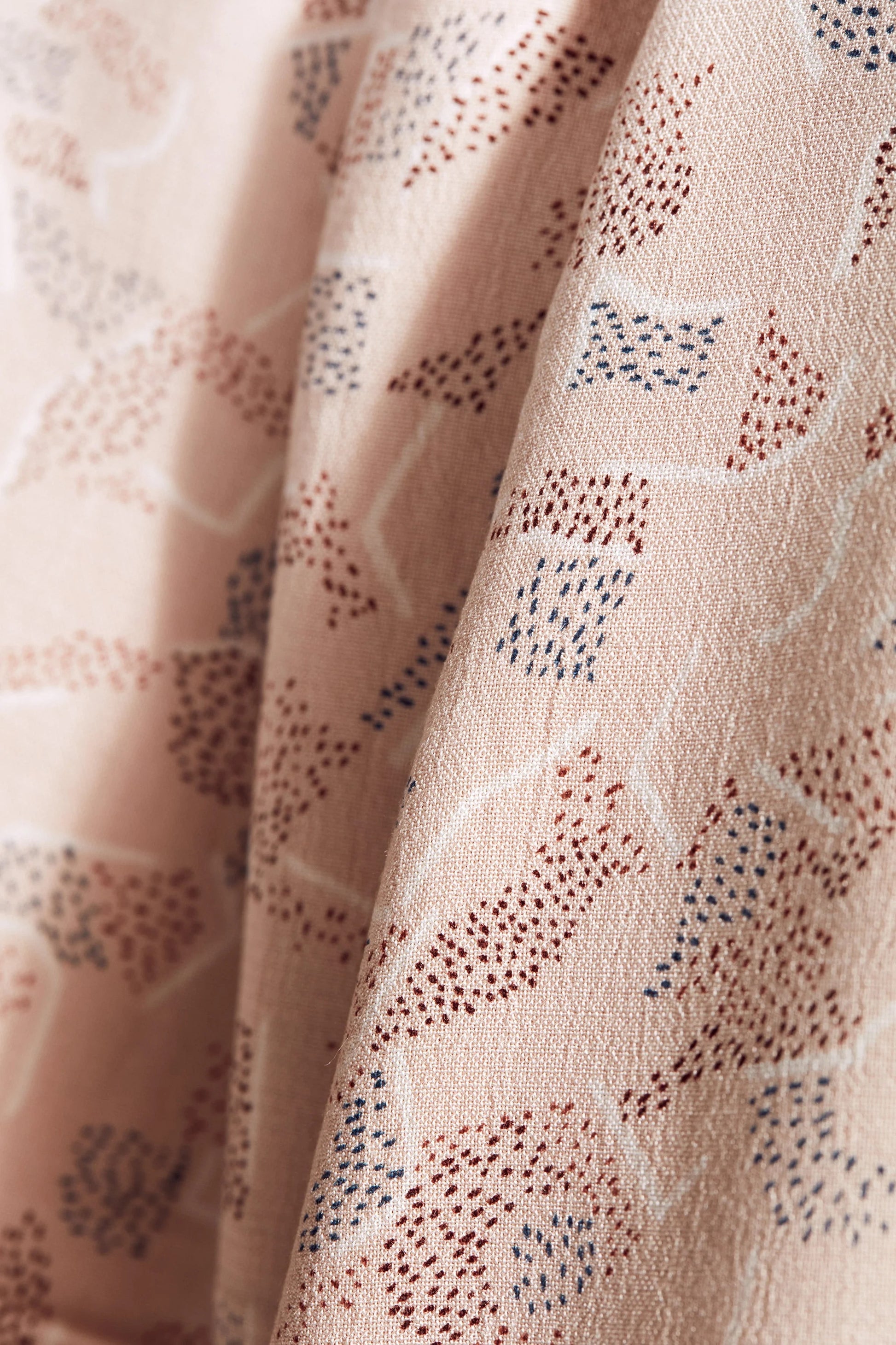 Mynstur með fíngerðum og geometrískum formum sem minna á kollage, létt og svolítið í anda kúbisma. Prentið er innblásið af verkum kúbíska listmálarans Veru Pestel og hentar sérstaklega vel í flíkur þar sem þú vilt bæði hreyfingu og karakter, til dæmis kjóla, blússur, skyrtur eða mjúkar buxur úr krep-viskós.